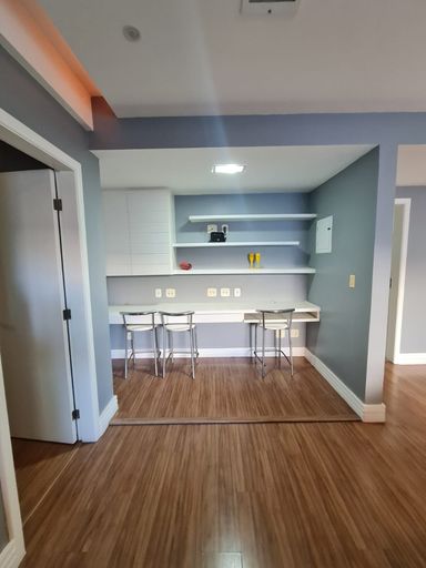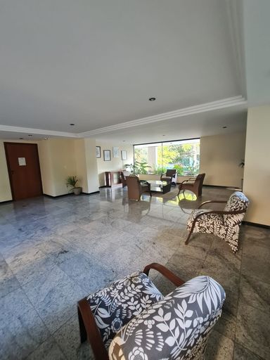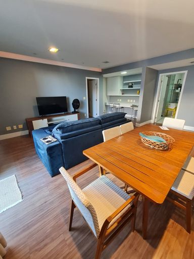 O imóvel conta com sala ampla em três ambientes, cozinha independente, três quartos sendo uma suíte, todos com acesso à varanda, além de banheiro social, área de serviço e banheiro de serviço. Possui duas vagas de garagem.