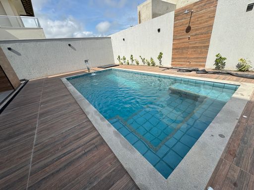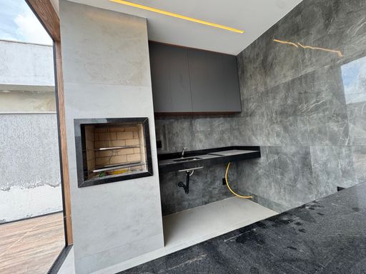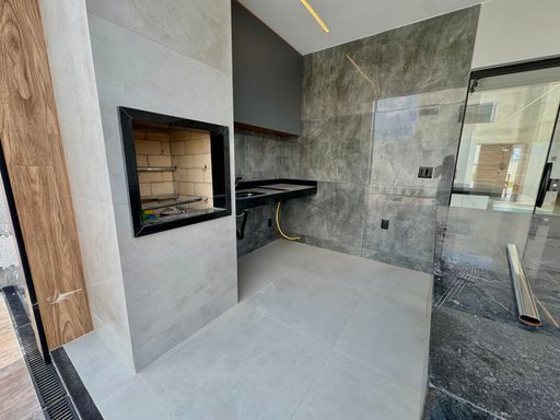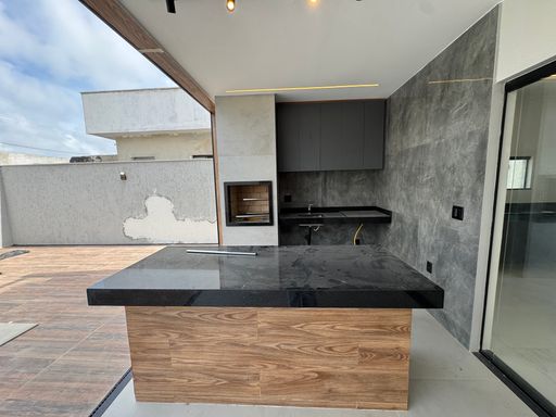 A área gourmet é completa e ideal para receber com estilo, equipada com churrasqueira profissional e bancada espaçosa, além de uma piscina de alvenaria com deck, perfeita para momentos de lazer sofisticado.