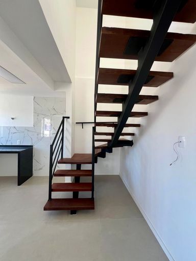 Já no segundo piso, o imóvel dispõe de uma sala de estar aconchegante, dois quartos (sendo uma suíte), banheiro social e uma excelente área gourmet com churrasqueira, além de varanda com chuveiro, perfeita para aproveitar os dias de sol.