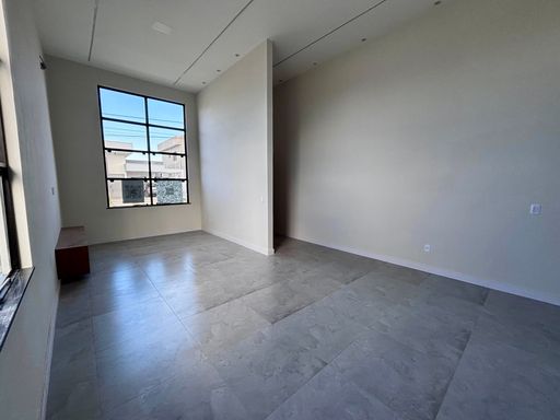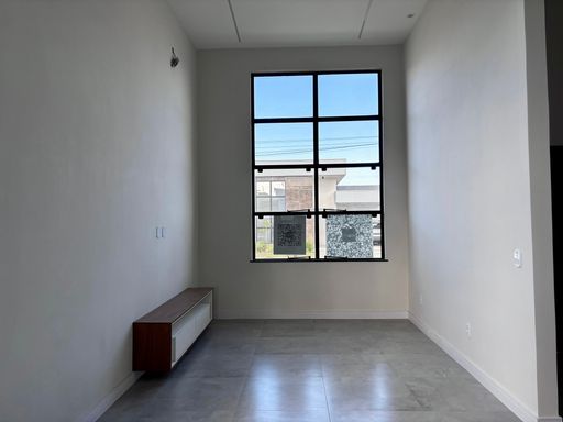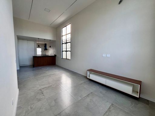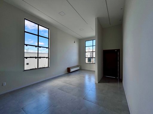 A sala possui pé direito duplo, garantindo amplitude e iluminação natural.