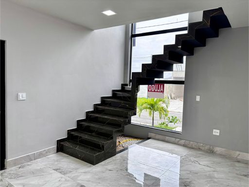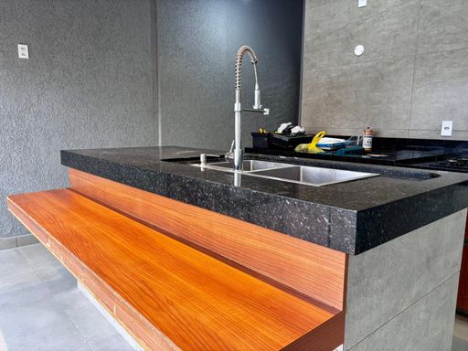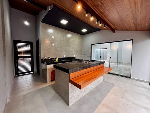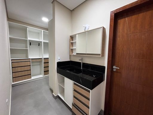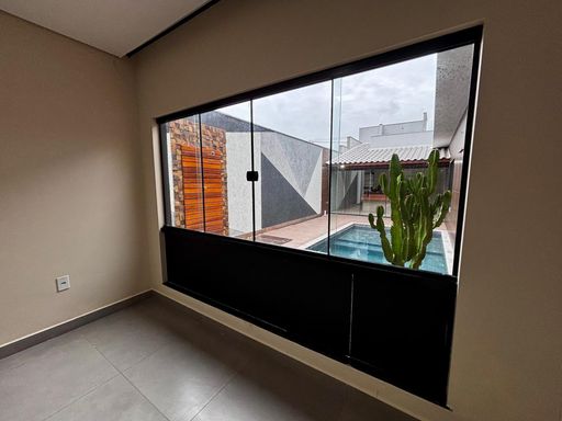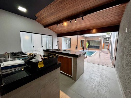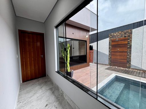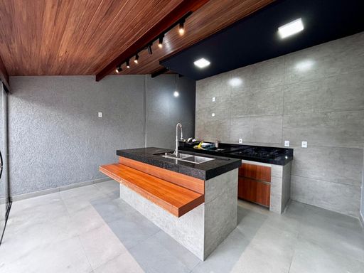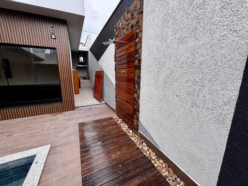 São três suítes, sendo a master com closet planejado e banheiro preparado para instalação de banheira, com vista privilegiada para a piscina e área gourmet. A residência ainda oferece garagem coberta para dois carros, entrada de serviço lateral, espaço para cozinha gourmet junto à lavanderia e banheiro social externo. Um diferencial marcante é o rooftop com acesso pelo mezanino, perfeito para criar um ambiente de convivência e descontração, com vista encantadora.