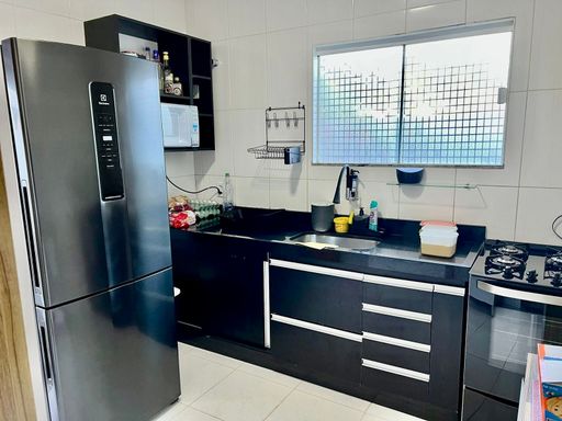 A casa conta com 3 quartos, sendo um localizado no andar térreo e outro com varanda, 3 banheiros (um no térreo), sala ampla e cozinha com planejados.